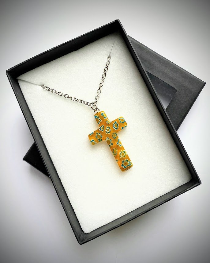 Koru on tehty italialaisesta millefiori-lasista. Tekniikan nimi ”tuhat kukkaa” viittaa pieniin, sulatettuihin lasikukkiin. Jokainen risti on ainutlaatuinen. Mukana säilytysrasia.