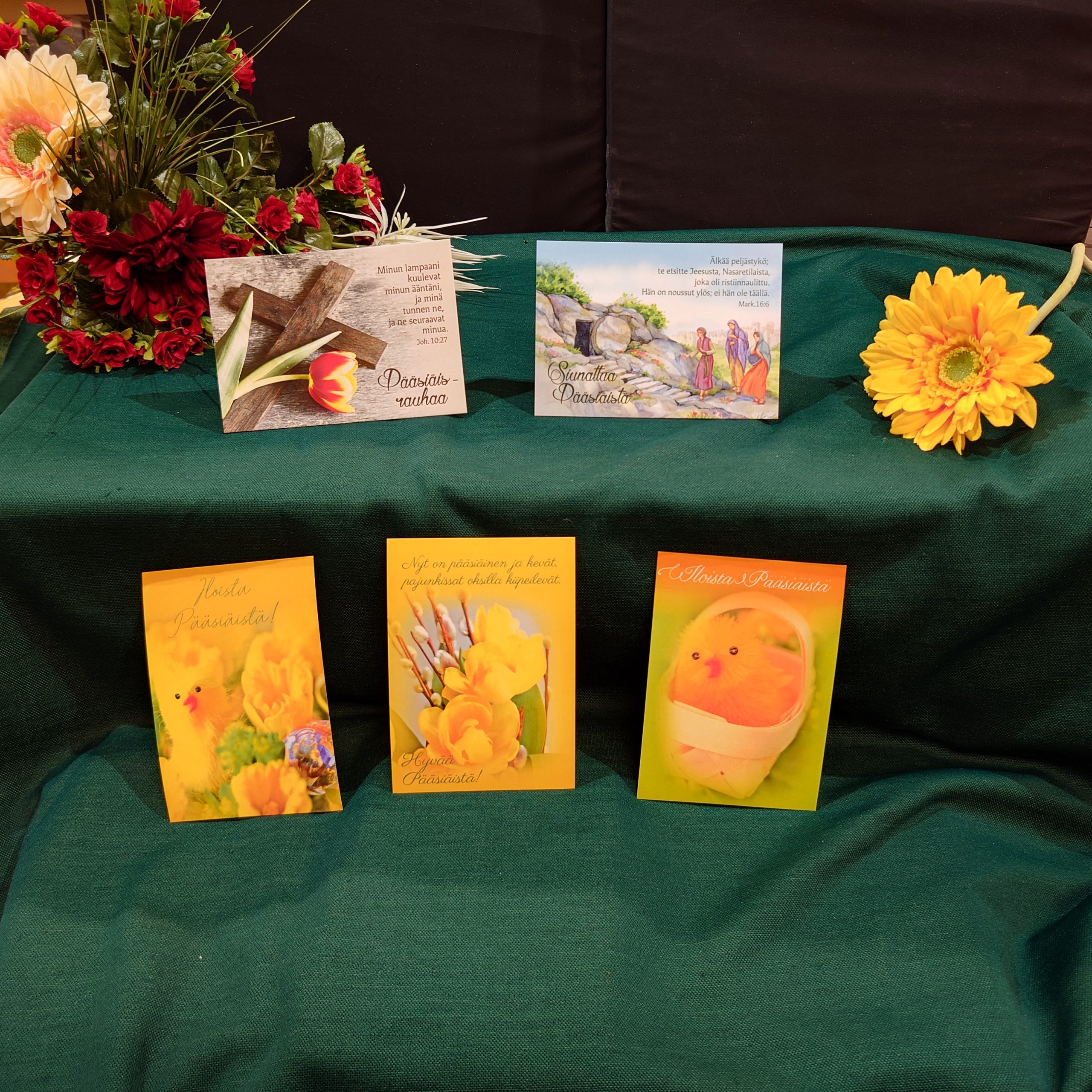 Viiden A6-kokoisen postikortin lajitelma. Takana tekstinä: Rauhallista pääsiäistä/Hyvää pääsiäistä. Kortit painettu suomessa.